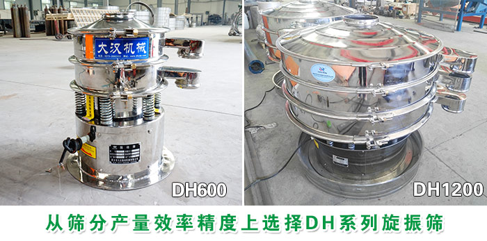 DH系列旋振篩型號齊全產量大,型號分為直徑400mm型、600mm型、800mm型、1000mm型、1200mm型、1500mm型、1800mm型、2000mm型等八種標準機型。篩分分級橡膠粉處理量可達400kg-2T/h,可將物料沿著篩網篩面充分篩分,過網率高篩分精度可達95%。