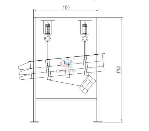 吊掛式直線振動(dòng)篩分機(jī)為雙振動(dòng)電機(jī)驅(qū)動(dòng)。當(dāng)兩臺振動(dòng)電機(jī)做同步、反向旋轉(zhuǎn)時(shí),其偏心塊所產(chǎn)生的激振力在平行于電機(jī)軸線的方向相互抵消,在垂直于電機(jī)軸的方向疊為一合力,因此篩機(jī)的運(yùn)動(dòng)軌跡為一直線。兩電機(jī)軸相對篩面在垂直方向有一傾角,在激振力和物料自重力的合力作用下,物料在篩面上被拋起跳躍或向前作直線運(yùn)動(dòng),從而達(dá)到對物料進(jìn)行篩選和分級的目的。