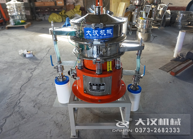 氣體保護(hù)篩分機(jī)是直徑600mm型號,一層兩個出料口,再原有圓形篩分機(jī)的基礎(chǔ)上加裝氣體保護(hù)裝置,與物料接觸部分是304材質(zhì),采用立式振動電機(jī)作為激振源,電機(jī)上、下兩端安裝有偏心重錘,將電機(jī)的旋轉(zhuǎn)運動轉(zhuǎn)變?yōu)樗健⒋怪薄A斜的三次元運動,再把這個運動傳遞給篩面。