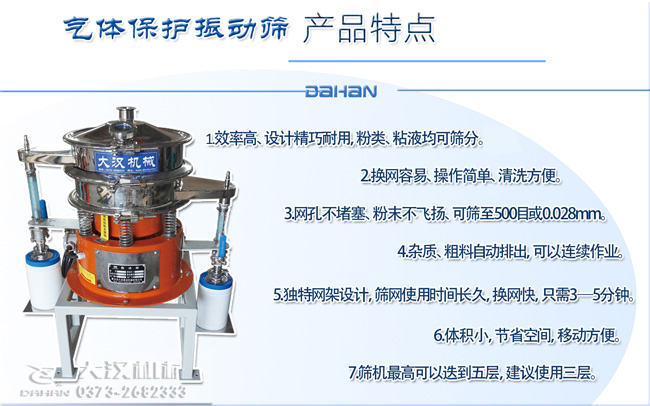 產(chǎn)品簡介: 氣體保護(hù)篩分機(jī)采用304不銹鋼材質(zhì),氣體保護(hù)軟管,防靜電裝置等制作而成。氣體保護(hù)篩分機(jī)型號是從φ400-φ1800mm直徑,氣體保護(hù)篩分機(jī)價格根據(jù)材質(zhì)和直徑大小、層數(shù)價格不同。